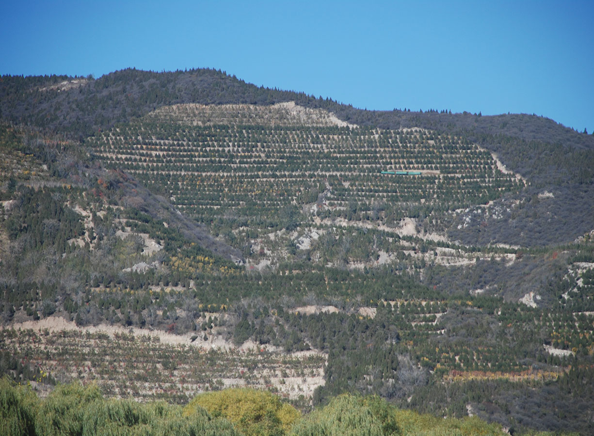 太山東立面生態(tài)修復(fù)工程施工中打破傳統(tǒng)施工工序,根據(jù)地形情況,因地制宜,從山頂往山下進(jìn)行地形修整,削頂放坡,加固后,采用臺(tái)階式整地成梯田。